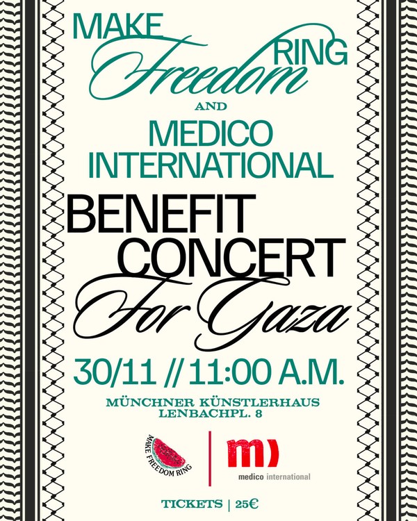 Die humanitäre Katastrophe in Gaza ist unterdessen nicht beendet. Die Enklave liegt in Trümmern, wann und wie sie wieder aufgebaut werden kann ist unklar. Um dieser fortgesetzten Zerstörung und Entmenschlichung etwas entgegenzusetzen und sich für einen gerechten Frieden einzusetzen, laden Künstler:innen und Musiker:innen zu einem klassischen Benefizkonzert im Münchner Künstlerhaus ein.