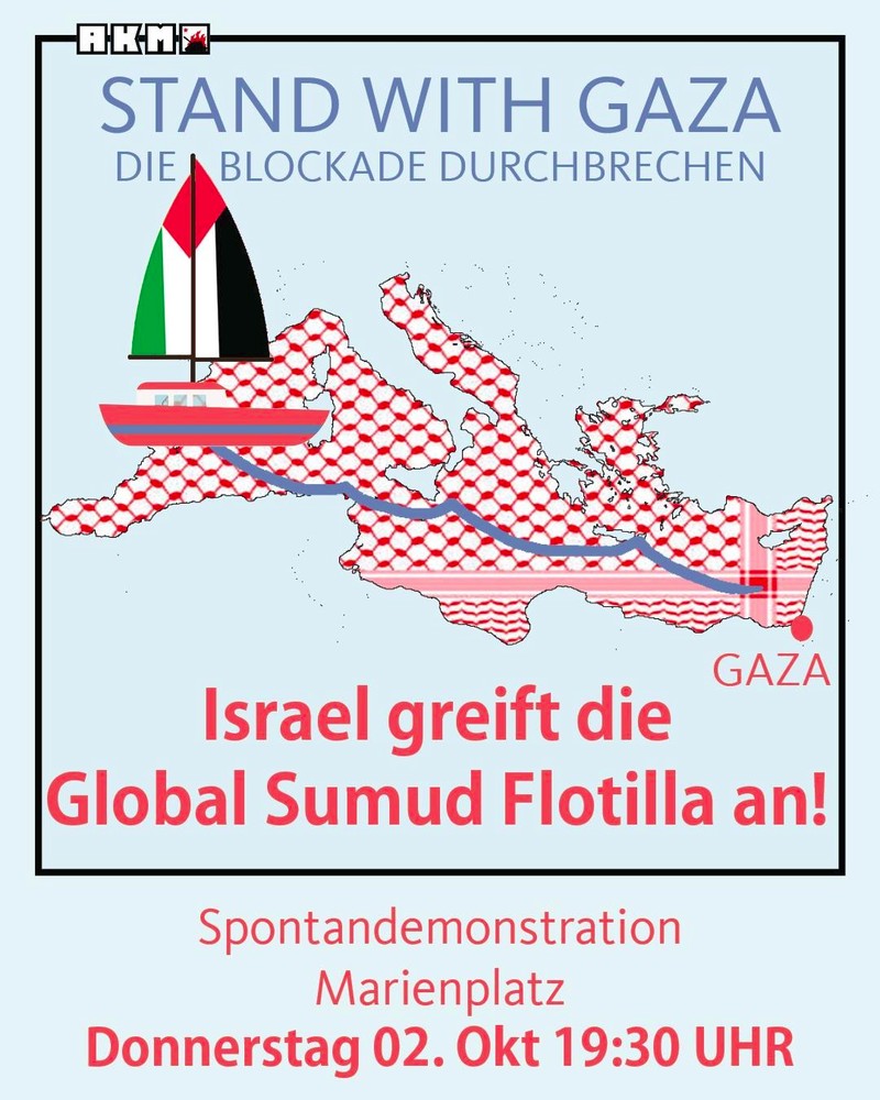 Während die Staaten weltweit den Genozid ermöglichen oder sich an ihm beteiligen, zeigt die Sumud Flotilla, dass der Widerstand von unten sich nicht brechen lässt. Die Global Sumud Flotilla ist mehr als 41 Boote - sie ist Symbol für den weltweiten Widerstand gegen den Genozid. Wir stehen an ihrer Seite!