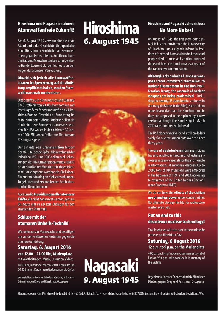 Mit einem Informationstag gegen die Modernisierung der Atomwaffen in Deutschland beging die Friedens- und Antiatombewegung in München das diesjährige Gedenken an die Opfer von Hiroshima und Nagasaki.