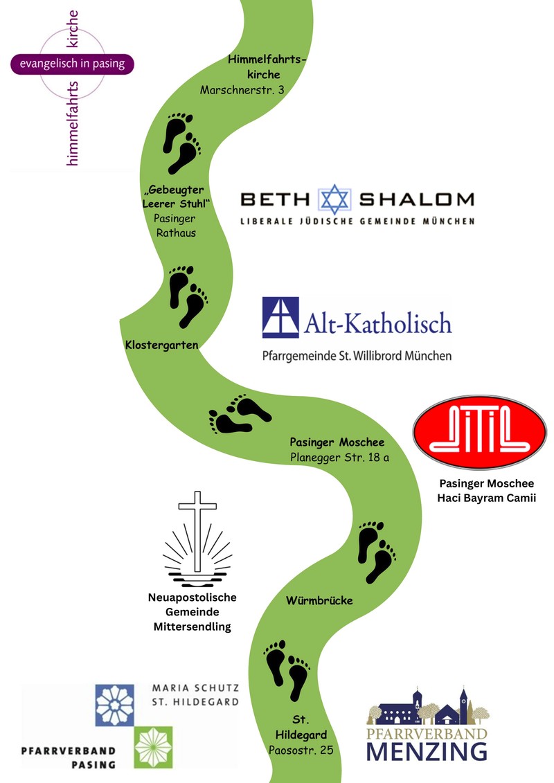 Der Teilnehmerkreis unserer Initiative hat sich seit 2016 stetig erweitert. Neben dem katholischen Pfarrverband Pasing, der Pasinger Moschee und der Himmelfahrtskirche sind inzwischen auch die liberale jüdische Gemeinde Beth Shalom, der Pfarrverband Menzing, die altkatholische Kirche St. Willibrord sowie seit 2024 die neuapostolische Gemeinde Mittersendling dabei.