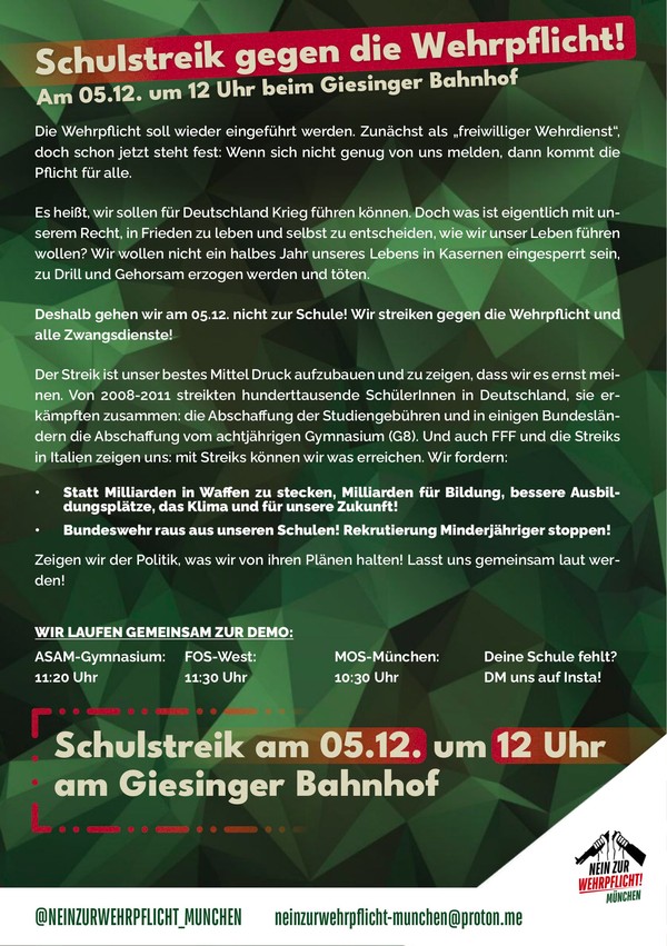Zeit 5. Dezember 2025 - 12:00 Bündnis Nein zur Wehrpflicht München ... schon am Vortag, Donnerstag 4.12.2025, zentraler Aktionstag Veranstalter Bündnis Nein zur Wehrpflicht München