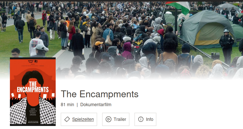 „The Encampments“ begleitet die Palästina-solidarischen Protest-Camps 2024 an der Columbia University und andere Palästina-solidarische Proteste an US-Universitäten, die sich zunehmender Diffamierungen,Kriminalisierung, Unterdrückung bis hin zu massiver Polizeigewalt ausgesetzt sehen. Anschließendes Filmgespräch mit: