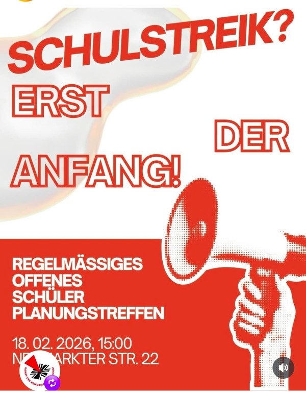 Schülerstreik - Nein zur Wehrpflicht Zeit 5. März 2026 - 11:00 Kundgebung Beginn 11 Uhr beim Ostbahnhof, dann Demo über Mariahilfplatz zum Marienplatz (mehr folgt) Ort Ostbahnhof Veranstalter Bündnis "Nein zur Wehrpflicht"